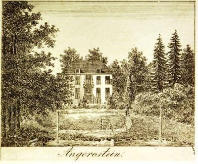 A. Wijnantz, kleurenlitho van huis Angerenstein, ca. 1850. Nieuw zijn de aanbouw en 'oranjerie'. Op de voorgrond een bloemperk, een zogenaamd bloemmandje.